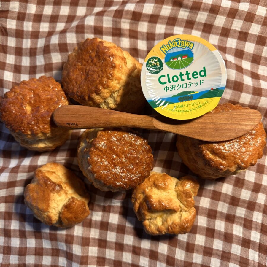 小麦粉はフランス産、バター、ブラウンシュガー、と低温殺菌の農協牛乳にこだわっています。あとくり抜く型の大きさ、大体小さいのが多いですから。中沢のクロテッドクリ-ム、僕の師匠はフォートナム&メイスンの2階のカフェ。