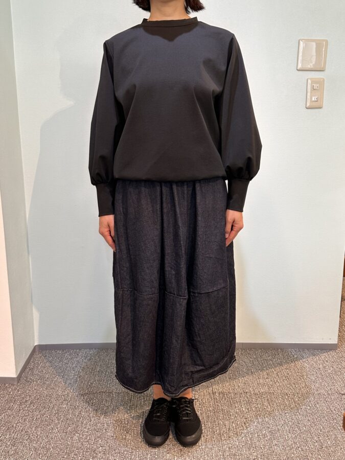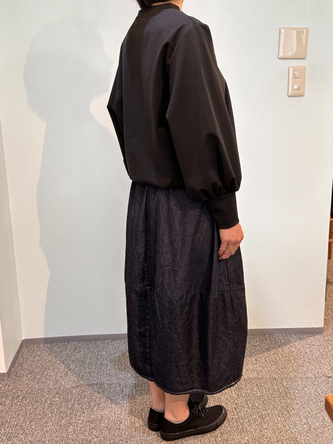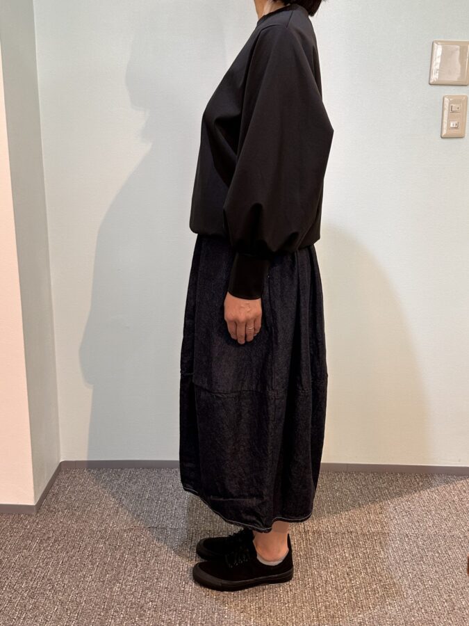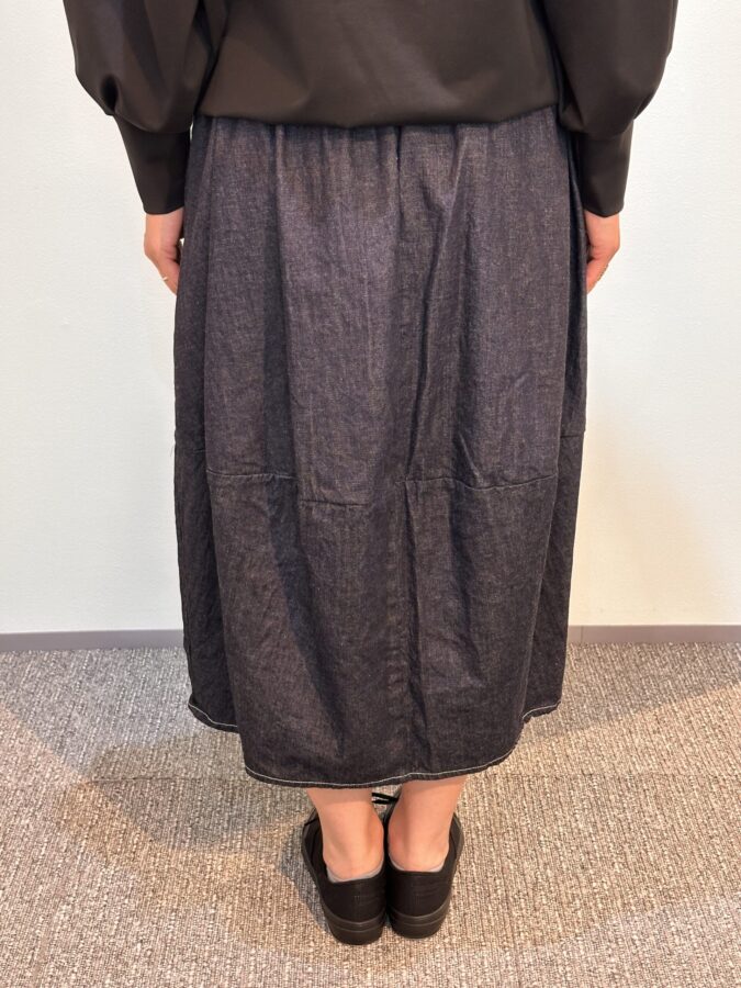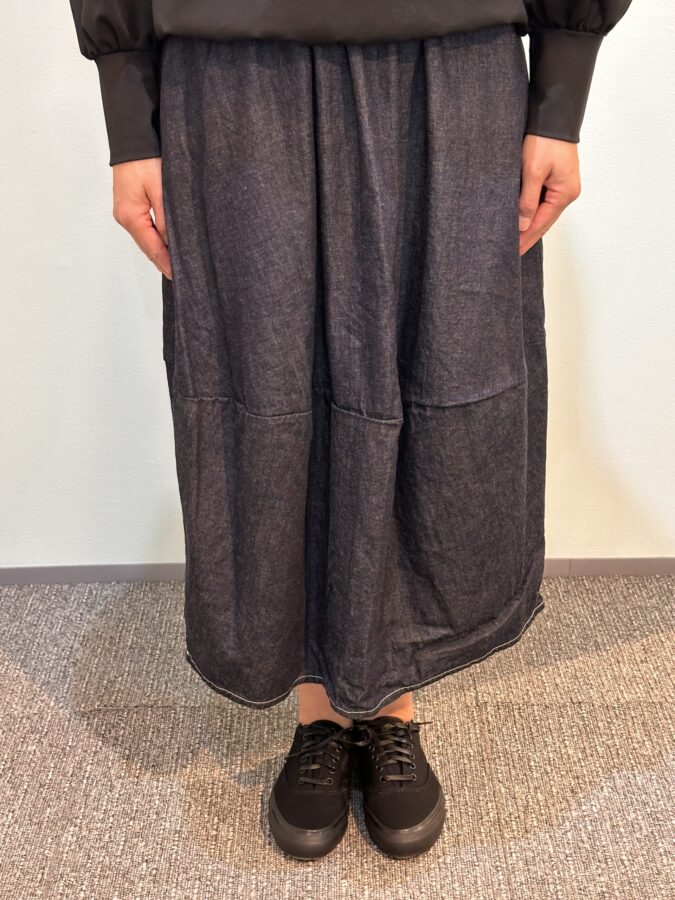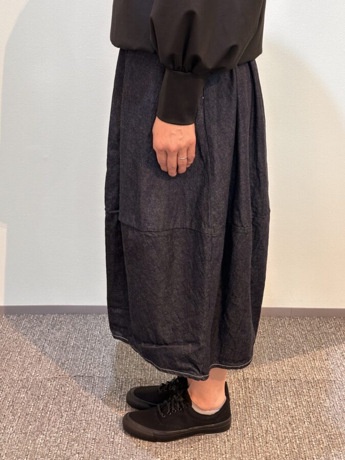 国産デニム生地を国内縫製して生産するキホン。デザインは人気沸騰のエッグスカート、つまりコクーン状態になっています。幾つになってもかわいさは欲しいと思う女性心理に適合したデザイン、動きがあるとテキメンに効果があり、かわいさが際立ちます。なんでもなさそうなスカートがボリュームとそのデザイン性により、お気に入りになる。夏に向かうふんわりとした快適性のライトオンスは気持ちをもやさしく、やわらかにしてくれます。