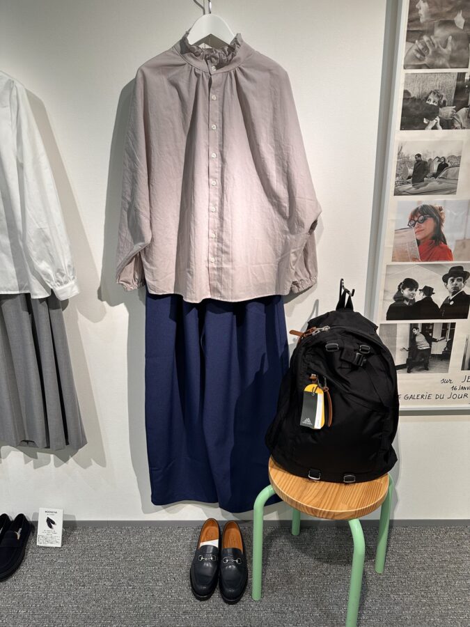 フリルのブラウスはワイドボディでフワッとコーデる。パンツもゆったりとデカい。色がいいブルーである、紺でもライトブルーでもなくて、いい色。それに合わせるのなんと言ってもグレゴリーの「隠しロゴ」ここにしかない逸品である、世にグレゴリー溢れるも、隠しロゴグレゴリーはここにしかない。価値観を問う逸品
