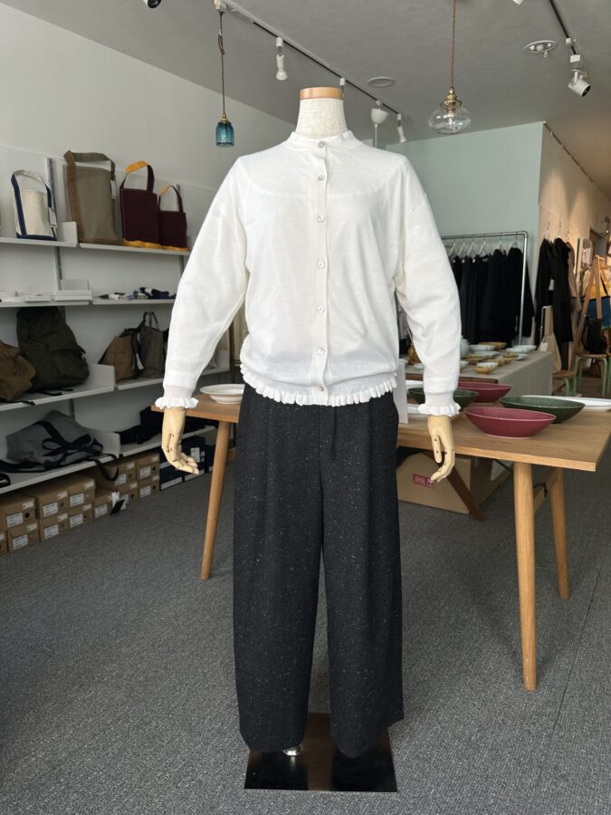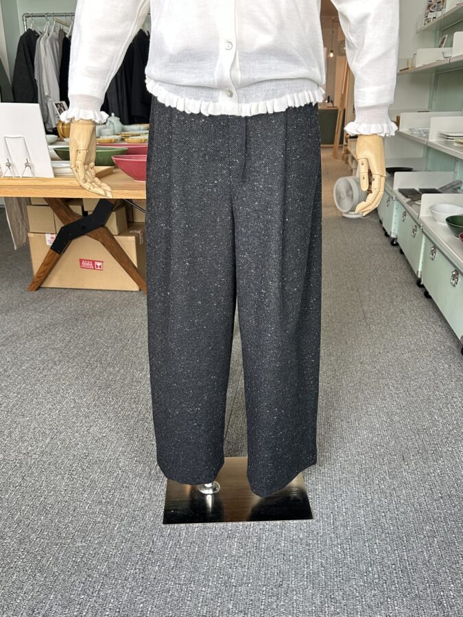 このネップツィードのパンツもゆとりの楽さがありながらも美しい生地、上は暑くても足元は寒かったりする人たちに、お色もこのグレーとブラウンがあります 生地、形、などをしっかり見て触って、選んでいます。いい服を、新しい服を今の自分に着させてあげる、自分を大事にする一歩は外見です。