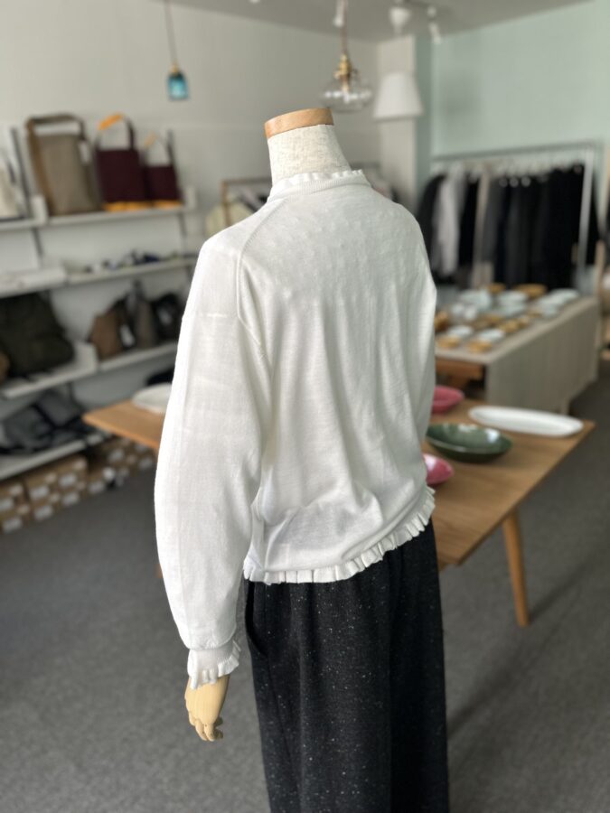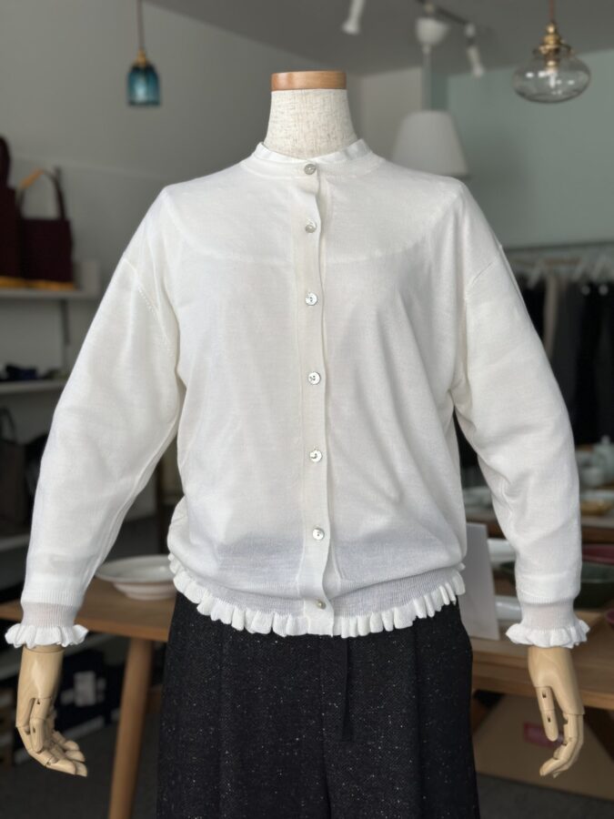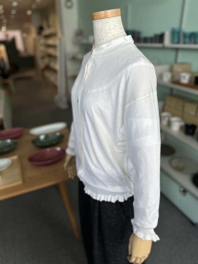 あっさりながらもフリルで特徴づけたフェミニンな表情がポイント 色は真っ白、この色と素材の薄さは羽織としての使い勝手が良くて、年中暑いと感じる世代に人気です。