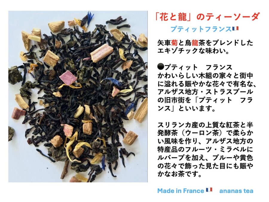アナナス・ティのフランス紅茶プティットフランスのアイス・ティーソーダとホットが三つ、フランス紅茶が二つとほうじ茶の都合4種類となります。