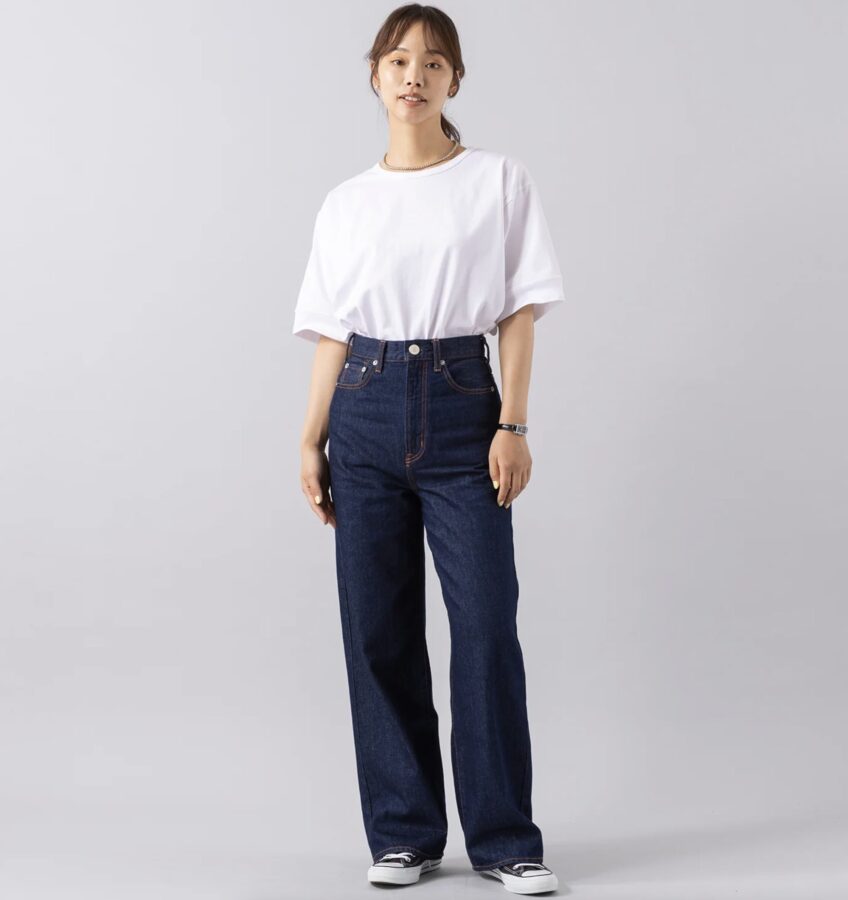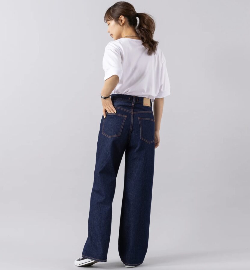 脚が長く見える、ハイウェスト ワタリからは太くなり、今のジーンズの見え方であり、特別な糸で柔らかくて軽い。岡山ならではのいろんな技術が入っている、今のGパン