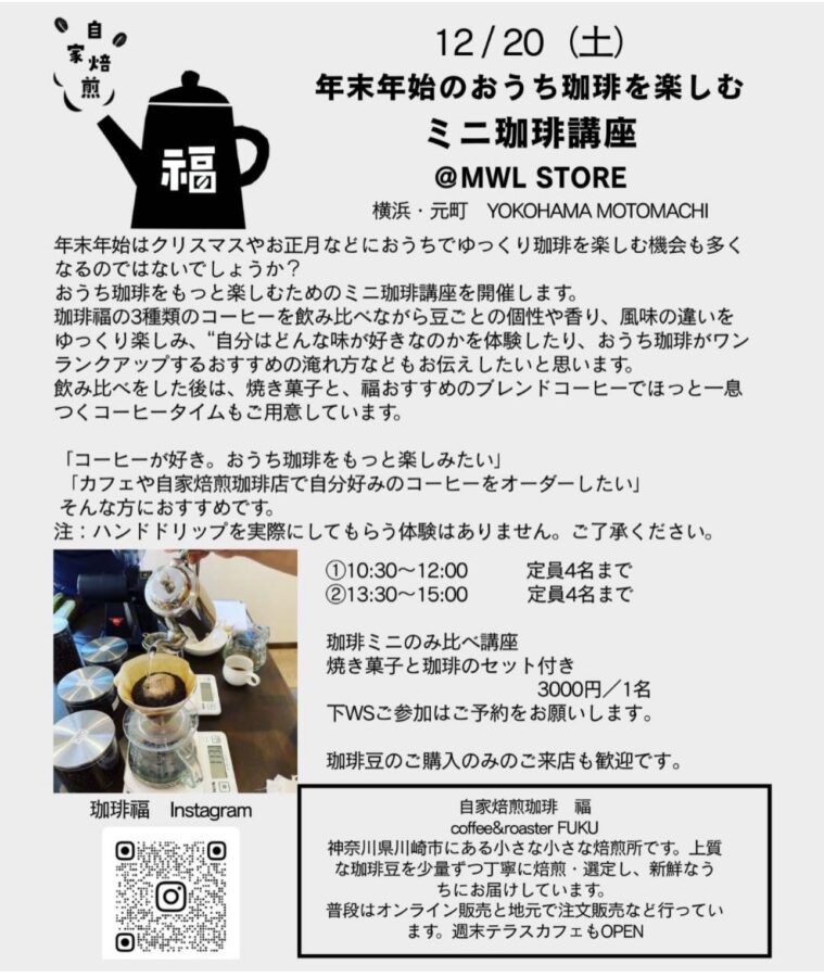 今回は事前予約制のミニ講座とクリスマス&年末年始のコーヒータイムにおすすめの珈琲豆の販売があります。
