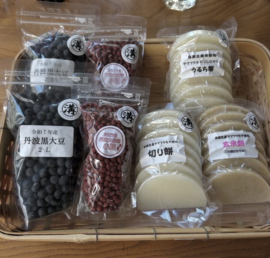令和7年産・新豆「丹波黒大豆」(減農薬栽培)、同じ<新豆「丹波大納言小豆」(減農薬栽培)、自家製産米を使用したつきたての「切り餅」「うるち餅」「玄米餅」を送っていただきました。