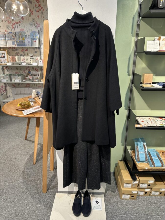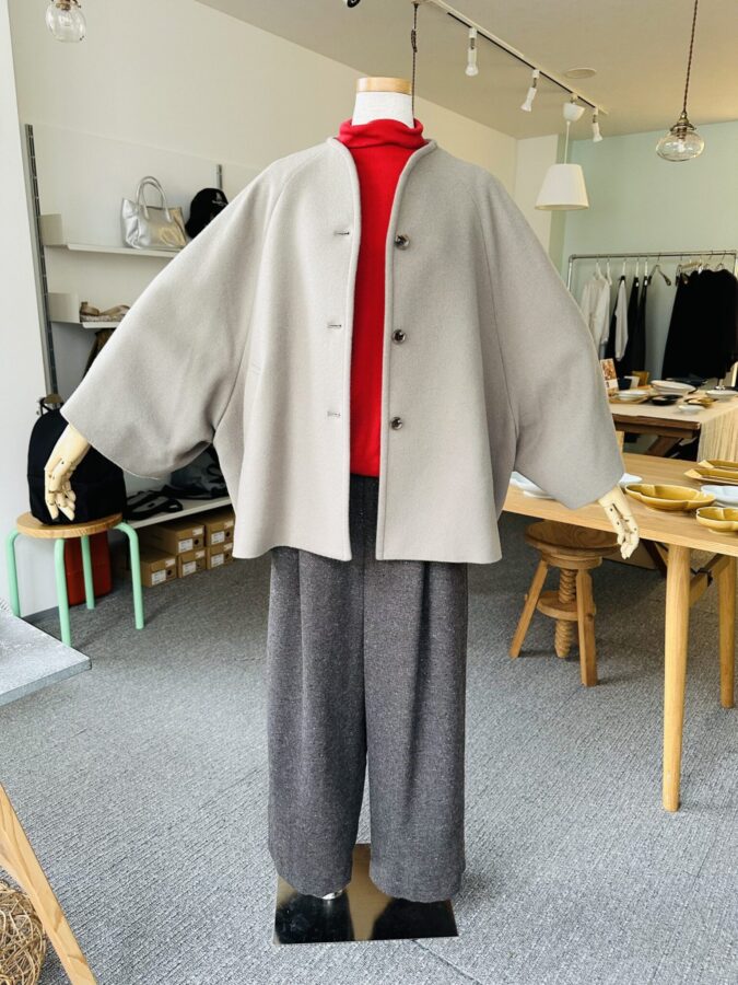 国産生地・尾州のウールを使った製品たち、今年のコートはスーパービーバーのとても柔らかい生地、今年のテーマは私的には制服でした。女性がいつの時代年齢になっても、自分らしくしっくりと着用できる服などそう多くはありません。