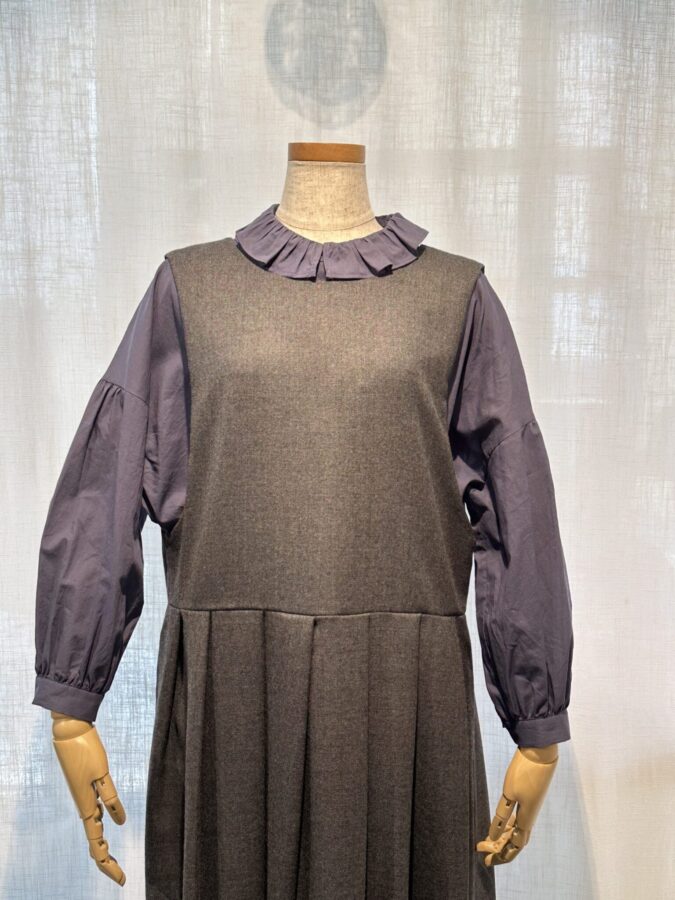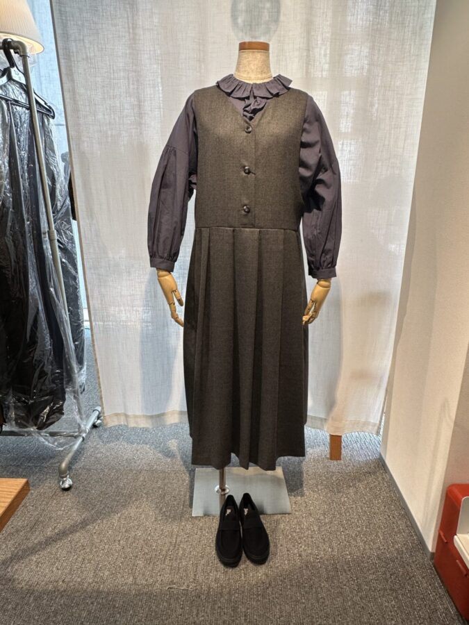 ジャンスカは前後に着れます。清楚系でもただの制服っぽさじゃなくて、ちゃんとモードのエッセンスを付加しました。色はグレーです。カーディガンを羽織って、布帛のコートで、どこでもダウンじゃなくて、スタイルしましょ。