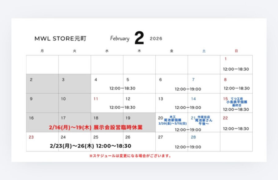 2026年2月1日 Liberal Arts 2月の予定 MWL STORE 月・火曜日定休日のシフトに戻ります。 「豪の春」木工の尾池豪さんの個展が20日(金)から もう春です。今年も一気に春がやってきます。春のパンツが勢揃いしています。いいですよ。