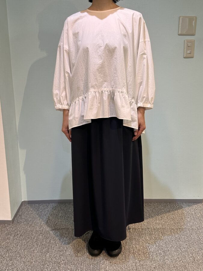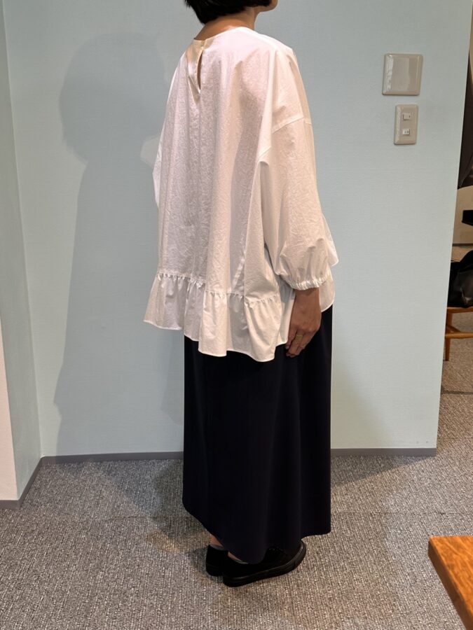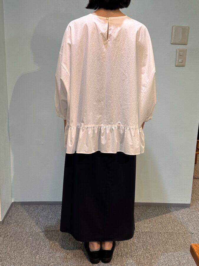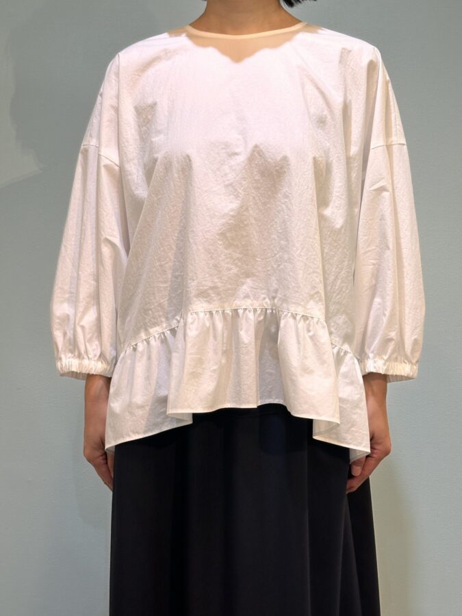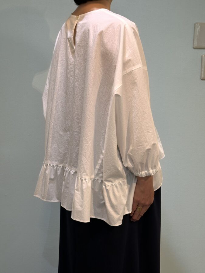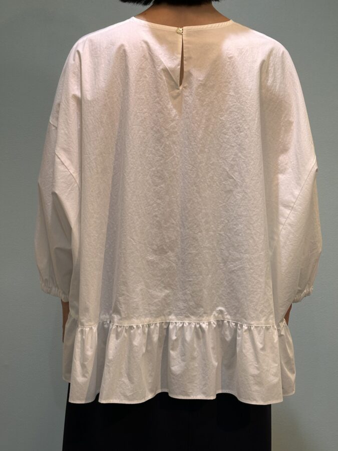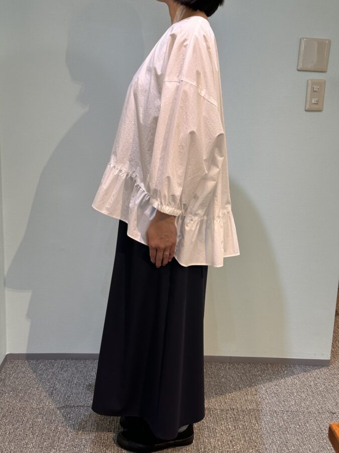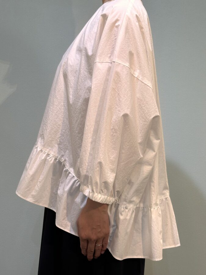 このブラウスはサイズのゆとりや、フリルの形状や配置している場所により、暑く長い夏の陽射しのもとでも日焼けや冷房下の環境で、快適に過ごせる、夏場の七分丈ブラウスの位置付けであり、それぞれのリラックス感が加味された心地よい素材構成、デザイン構成がお気に入りの一枚となります。ボトムスとの相性次第で綺麗目にもカジュアルにも着こなせるという数少ないアイテムであるといえます。