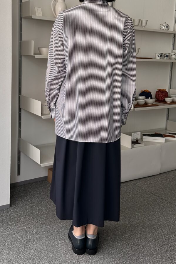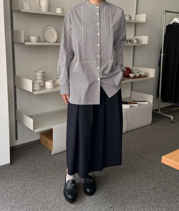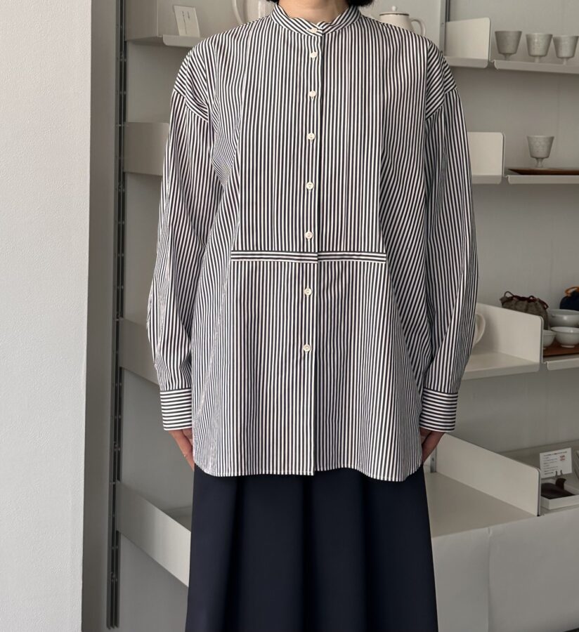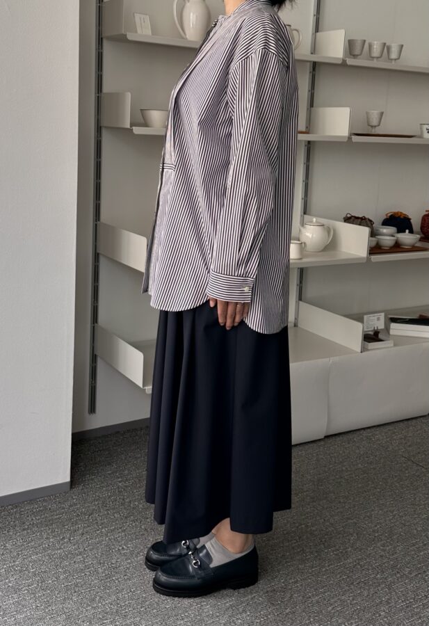 スタンドカラーの良さは一番上までボタンを留めても、普通の襟付きのカラーシャツよりも、多様性と洒落感が出ているところにあります。しかもフロント部分にタックを入れて、ワイドに大きくして、多様性のあるお洒落なシャツ、ブラウス表現の可能性を秘めさせています。ヨーロッパの人はこういう大きめのブラウスの着こなし表現がとてもうまいですね。日本も学ぶことです。