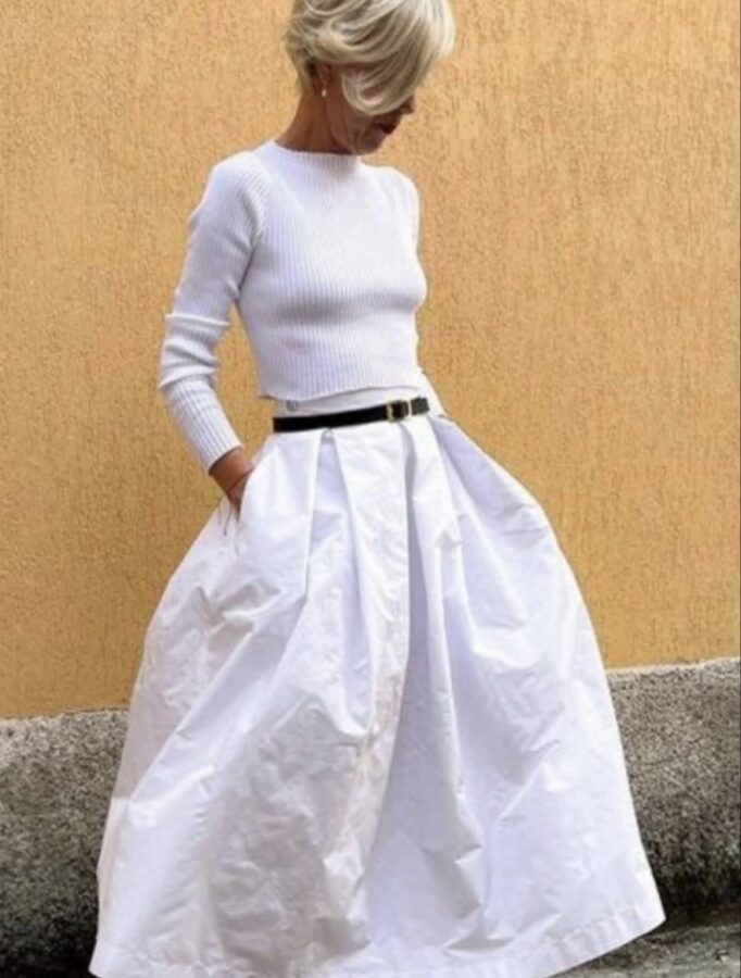 フィット&フレア トップスをフィットさせて、ボトムスをフレアさせてる、海外写真の今季もの。
